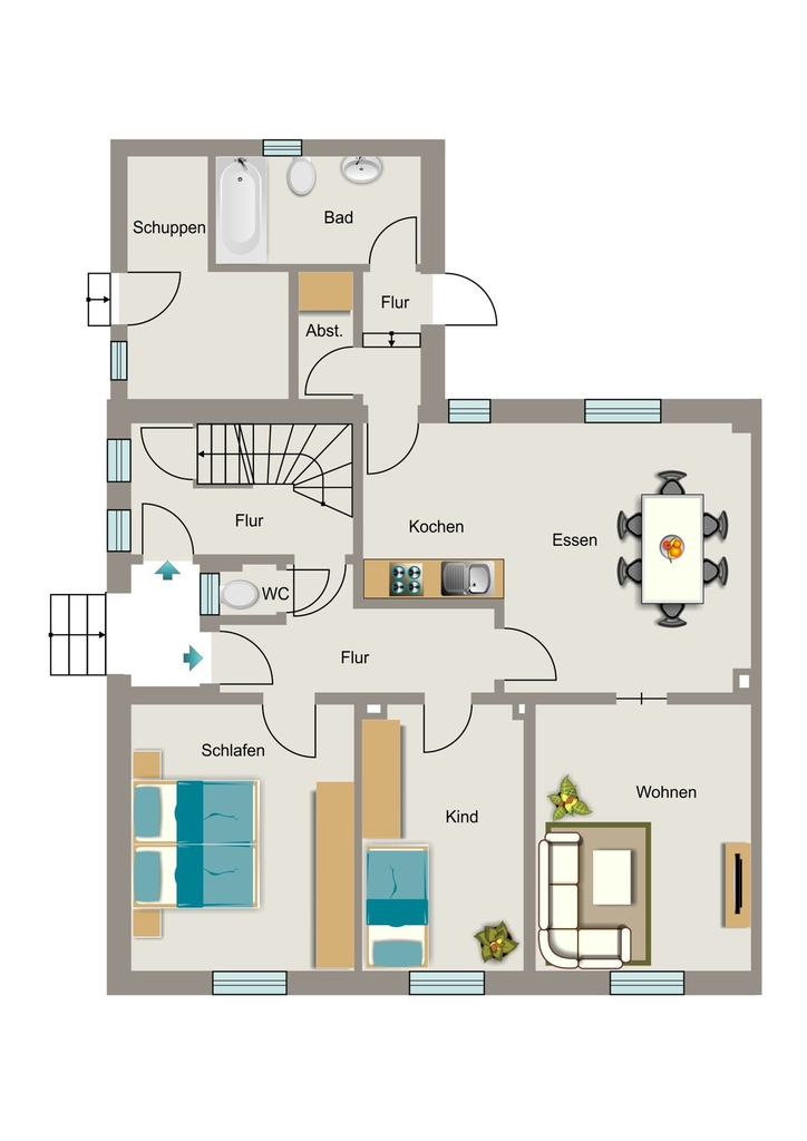 Die Erdgeschosswohnung, mit einer Wohnfläche von ca. 78 m², verfügt über einen separaten Eingang und ist derzeit vermietet. Das bestehende Mietverhältnis ist vom Käufer zu übernehmen. Die Wohnfläche teilt sich auf in eine Diele, ein Gäste-WC, ein Schlafzimmer, ein Kinderzimmer sowie einem offenen Koch- und Essbereich. Angrenzend befindet sich das Wohnzimmer. Über eine weitere Diele gelangt man in das Badezimmer, den Abstellraum sowie zum Zugang in den Garten.