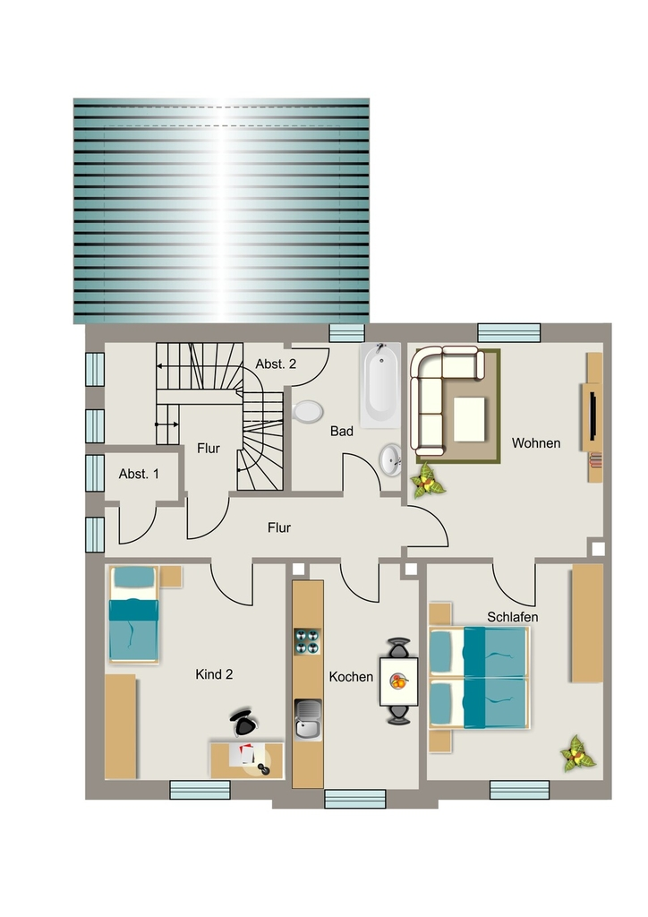 Die Obergeschosswohnung, mit ca. 65 m² Wohnfläche, steht aktuell leer und ist über das gemeinschaftlich genutzte Treppenhaus erreichbar. Sie umfasst eine Diele, ein Kinderzimmer, eine Küche, ein Badezimmer sowie ein Wohnzimmer. Das Schlafzimmer ist direkt vom Wohnzimmer aus zugänglich. Auch diese Wohneinheit verfügt über einen eigenen Gartenbereich. Durch unseren virtuellen Rundgang bekommen Sie bereits vorab einen umfassenden Eindruck von der Raumaufteilung des Obergeschosses. Lassen Sie sich inspirieren und entdecken Sie Ihr potenzielles Zuhause. Den Rundgang erreichen Sie unter folgendem Link: https://www.vivawest.de/rundgang/ZCYk