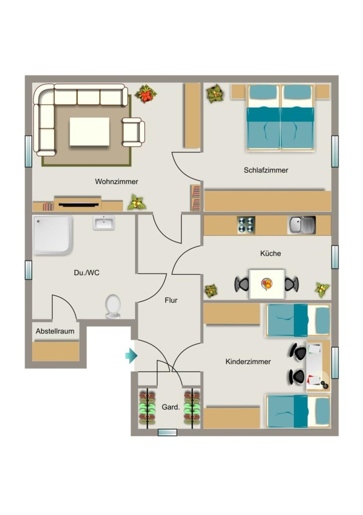 Die Erdgeschosswohnung, mit einer Wohnfläche von ca. 78 m², verfügt über einen separaten Eingang und ist derzeit vermietet. Das bestehende Mietverhältnis ist vom Käufer zu übernehmen. Die Wohnfläche teilt sich auf in eine Diele, ein Gäste-WC, ein Schlafzimmer, ein Kinderzimmer sowie einen offenen Koch- und Essbereich. Angrenzend befindet sich das Wohnzimmer. Über eine weitere Diele gelangt man in das Badezimmer, den Abstellraum sowie zum Zugang in den Garten.