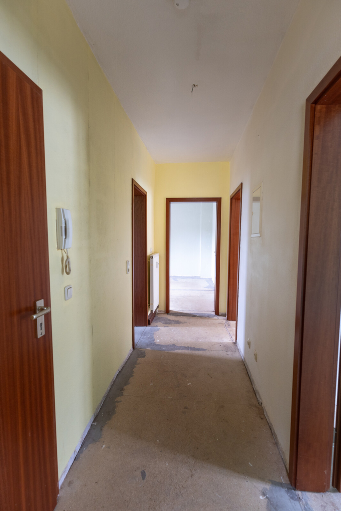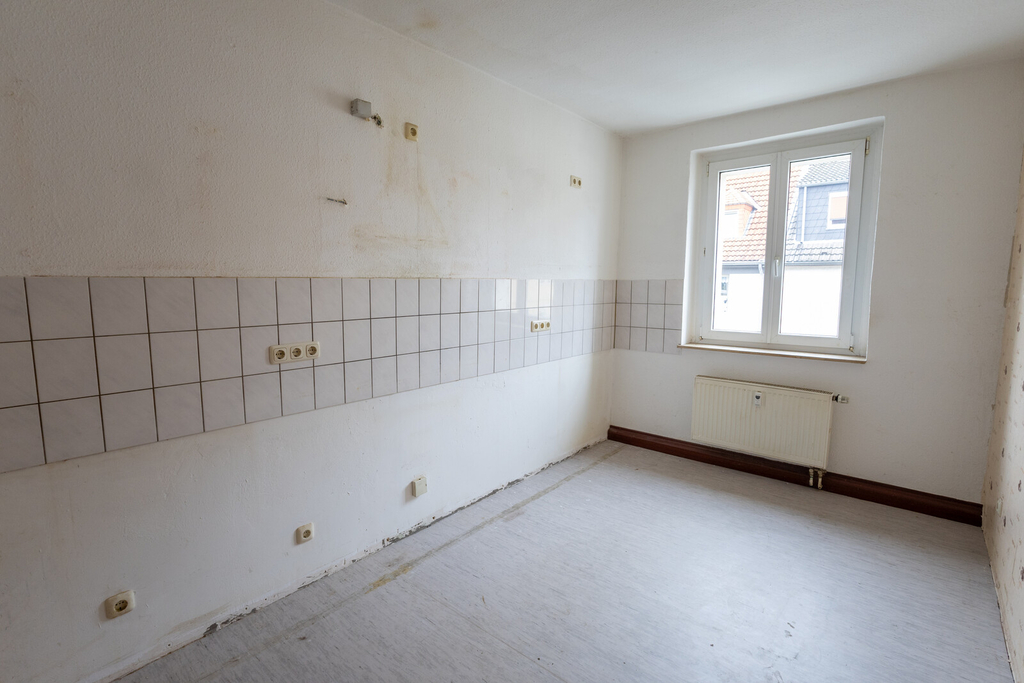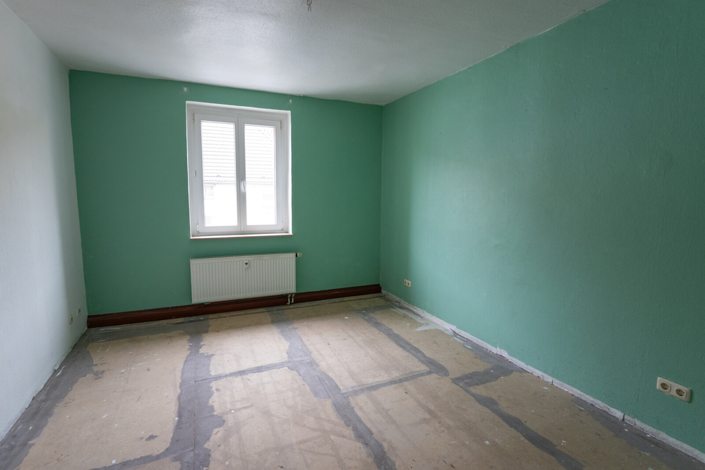 Die Obergeschosswohnung, mit ca. 65 m² Wohnfläche, steht aktuell leer und ist über das gemeinschaftlich genutzte Treppenhaus erreichbar. Sie umfasst eine Diele, ein Kinderzimmer, eine Küche, ein Badezimmer sowie ein Wohnzimmer. Das Schlafzimmer ist direkt vom Wohnzimmer aus zugänglich. Auch diese Wohneinheit verfügt über einen eigenen Gartenbereich.