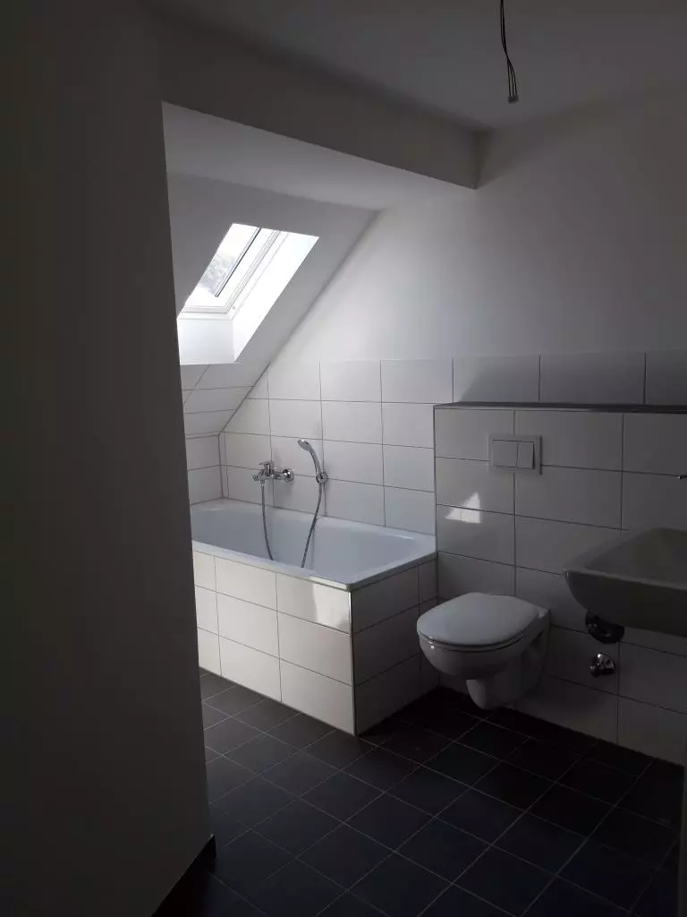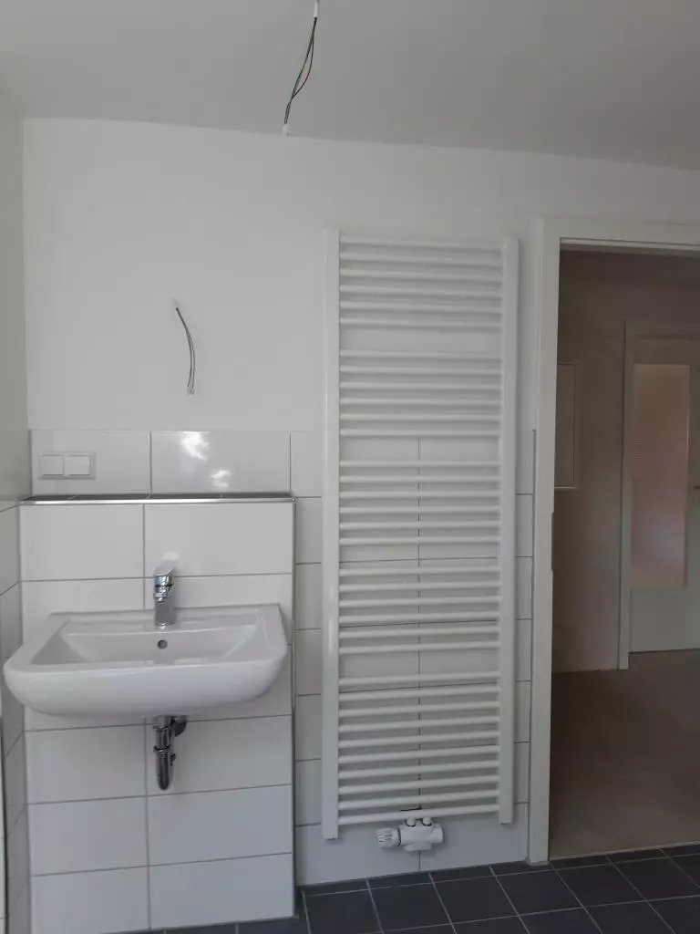 Die Wohnung verfügt über ein schönes neues Wannenbad, welches mit weißen Wandfliesen, grauen Bodenfliesen und zeitgemäßen Einrichtungsgegenständen (Handtuchtrocknerheizkörper) ausgestattet ist.