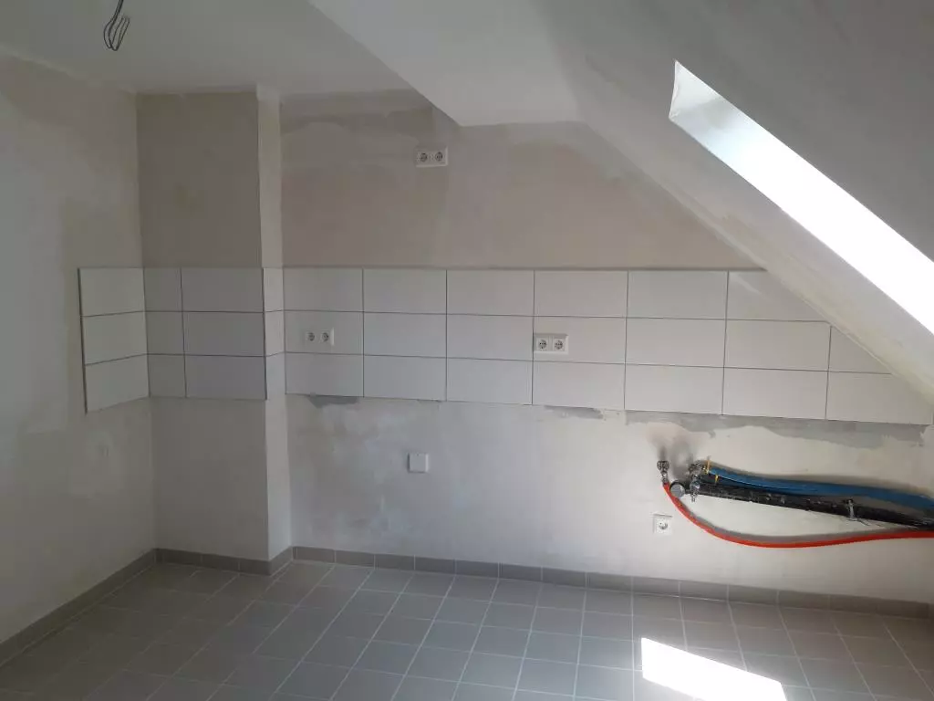 Die Küche verfügt ebenfalls über einen neuen weißen Fliesenspiegel, sowie graue Bodenfliesen.
