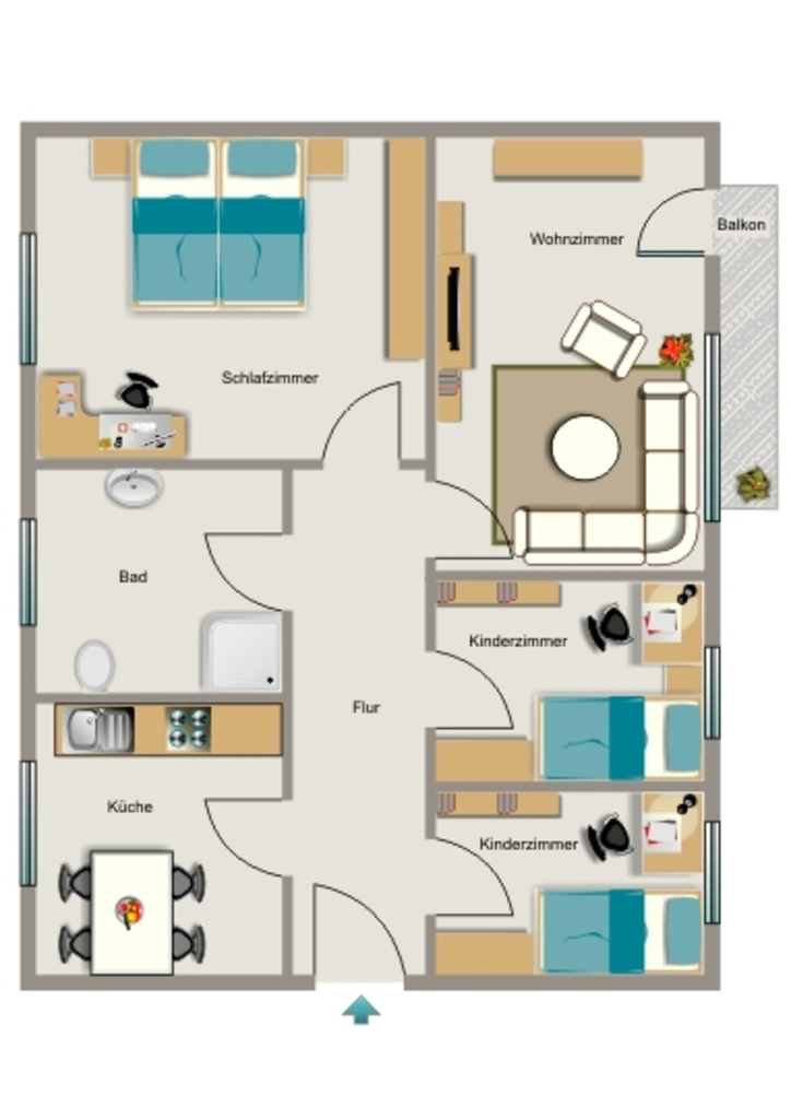 Die Wohnung ist wie folgt ausgestattet: - weißer Fliesenspiegel in der Küche -Wohnzimmer mit Zugang zum Balkon -2 Kinderzimmer -Duschbad mit Dusche und Fenster -Handtuchheizkörper -Rauchwarnmelder vorhanden -Gegensprechanlage vorhanden -1 Kellerraum -Waschmaschinenstellplatz in der allgemeinen Waschküche im Keller vorhanden