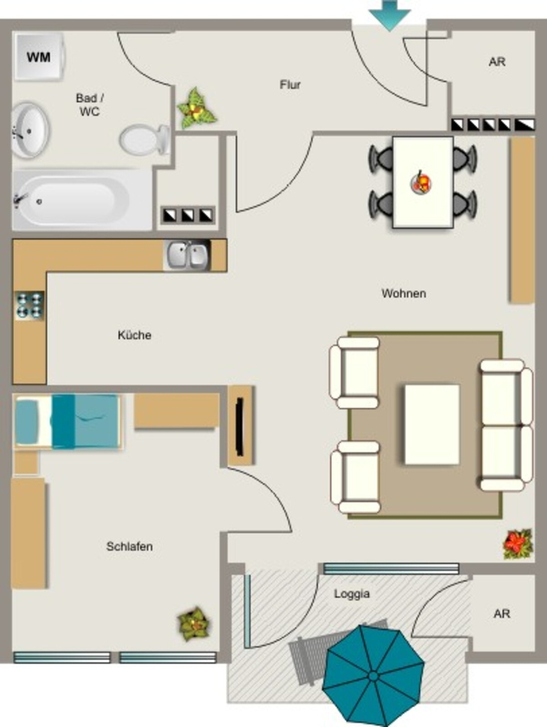 Wohnzimmer mit Kochnische, kleines Schlafzimmer, Diele, Abstellraum, Badezimmer