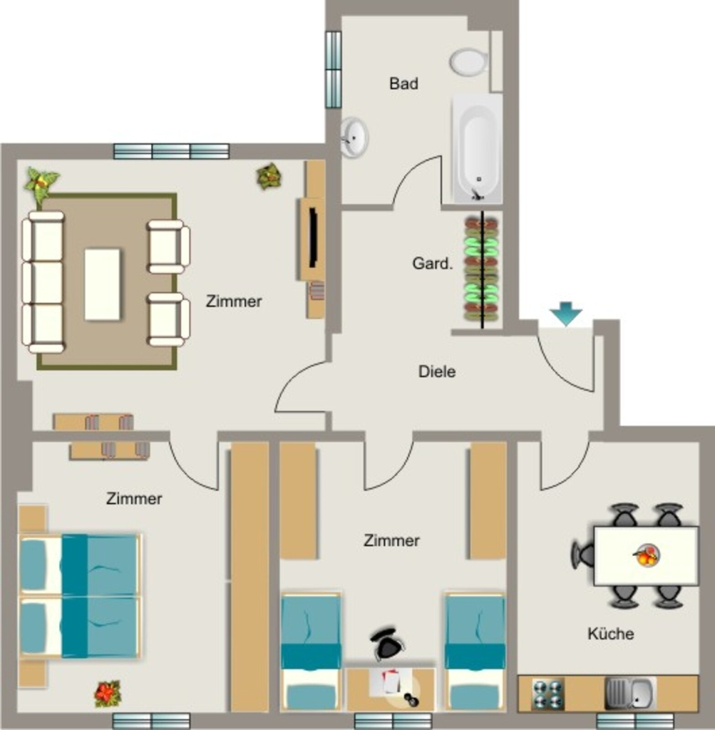 Das Schlafzimmer ist begehbar über das Wohnzimmer, die anderen Räume gehen vom Flur ab.